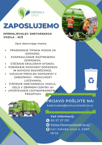 Komunala Idrija razpisuje prosto delovno mesto: “Spremljevalec smetarskega vozila – m/ž”. Natančnejše informacije si lahko preberete v razpisni dokumentaciji. Vsi, ki vas delovno mesto zanima, se lahko prijavite na kadrovska@komunalaidrija.si do vključno petka, 21. oktobra 2025.